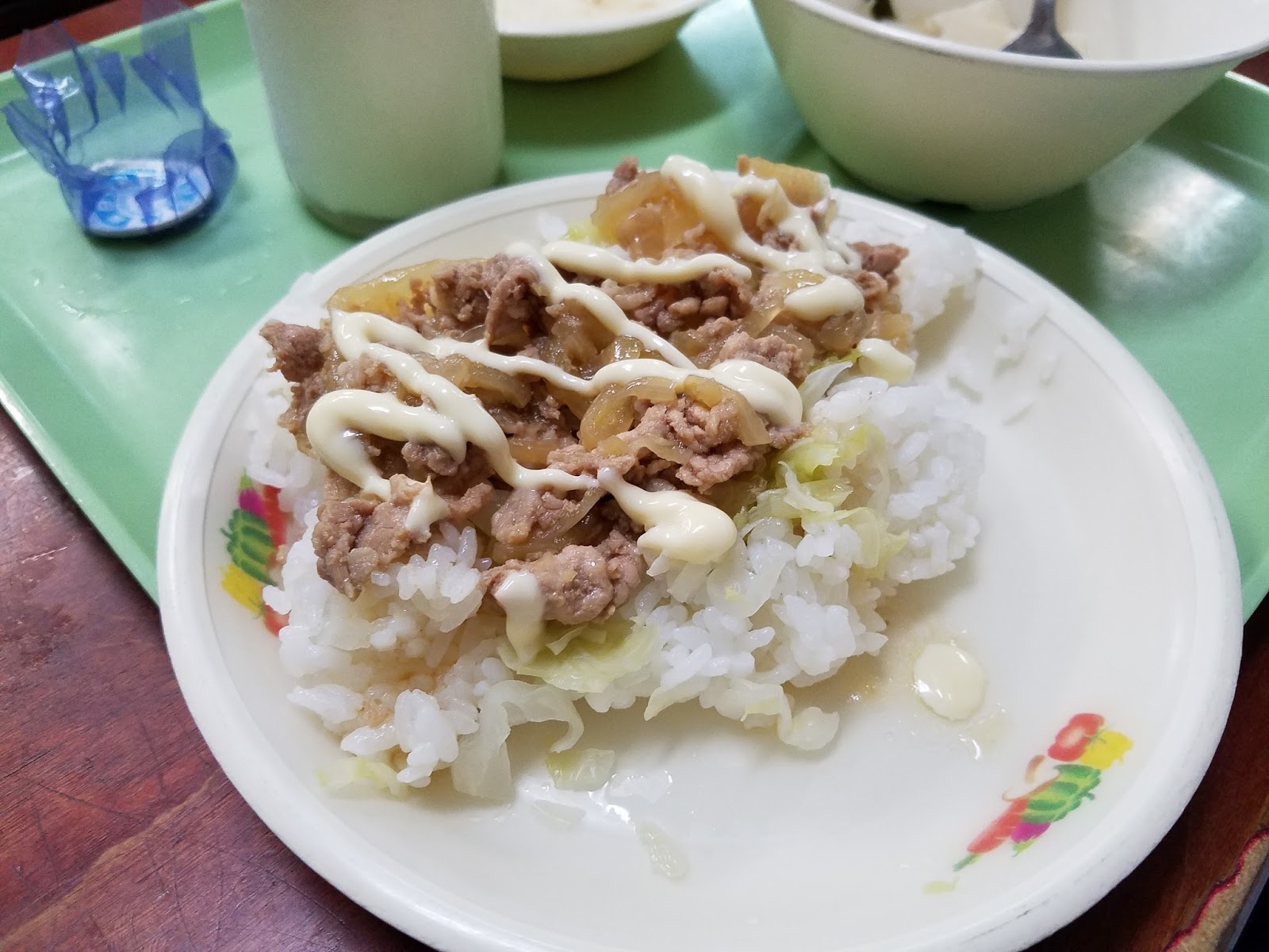 今日の給食は、豚肉の甘辛丼です。自分で丼にして食べるよう、献立表やメニューボード、担任の先生への朝の連絡で周知しました。